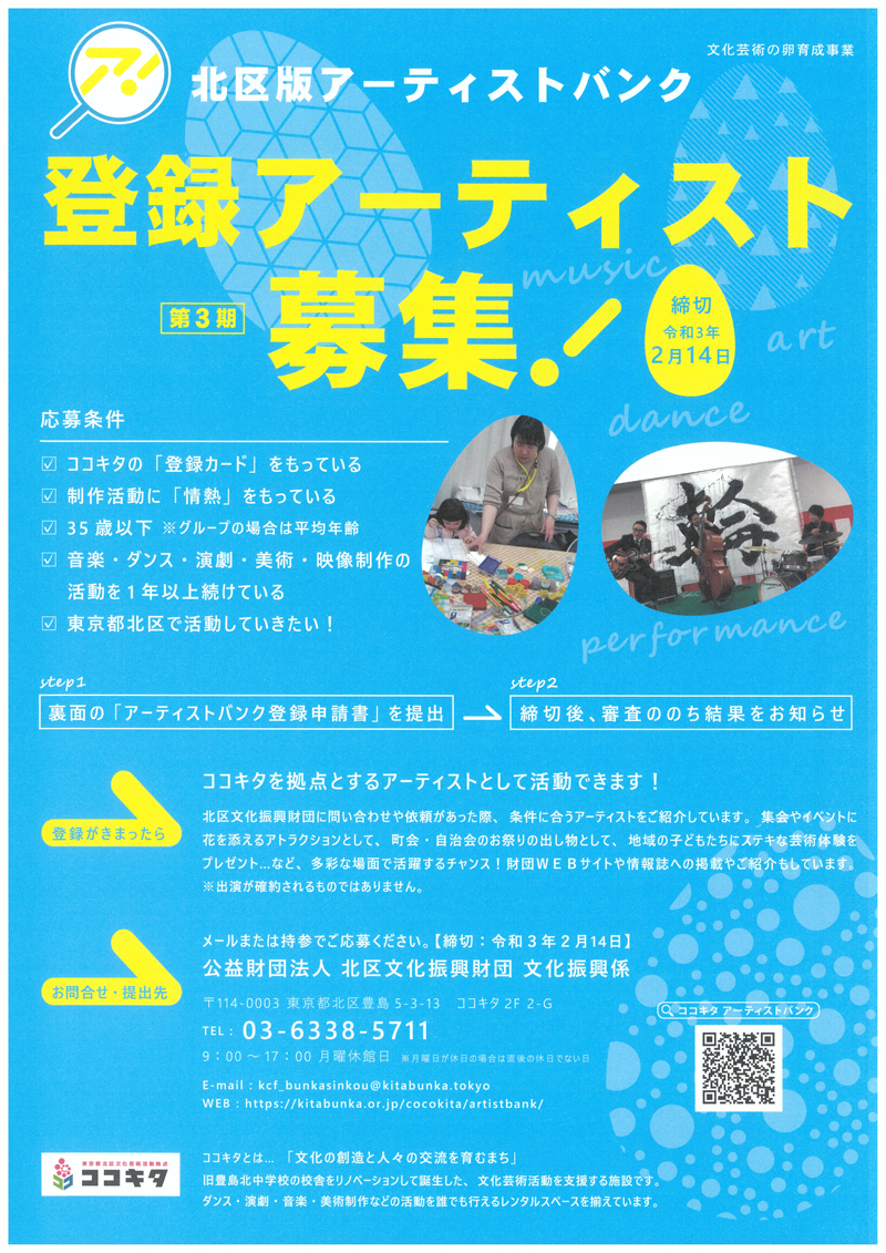 | 申請締切 | 令和3年2月14日(日)必着 (公財)北区文化振興財団 アーティストバンク担当 TEL:03-6338-5711(月曜を除く9~17時) 宛先:〒114-0003 東京都北区豊島5-3-13 ココキタ内 |