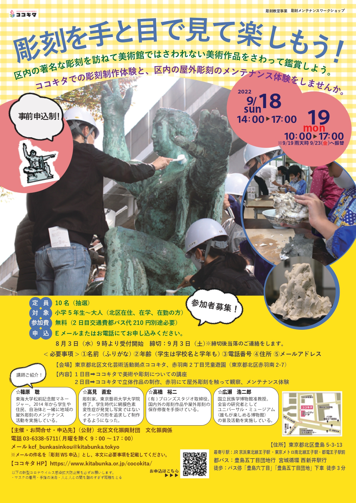 (公財)北区文化振興財団(ココキタ)文化振興係 TEL:03-6338-5711 (9:00~17:00/月曜日休館) 〒114-0003 東京都北区豊島5-3-13 E-mail: kcf_bunkasinkou@kitabunka.tokyo ※メールのタイトルは「彫刻WS申込」とし、必要事項を記入のうえお申し込みください。 ※上記メールアドレスからのメールを受信できるように設定してください。 |
