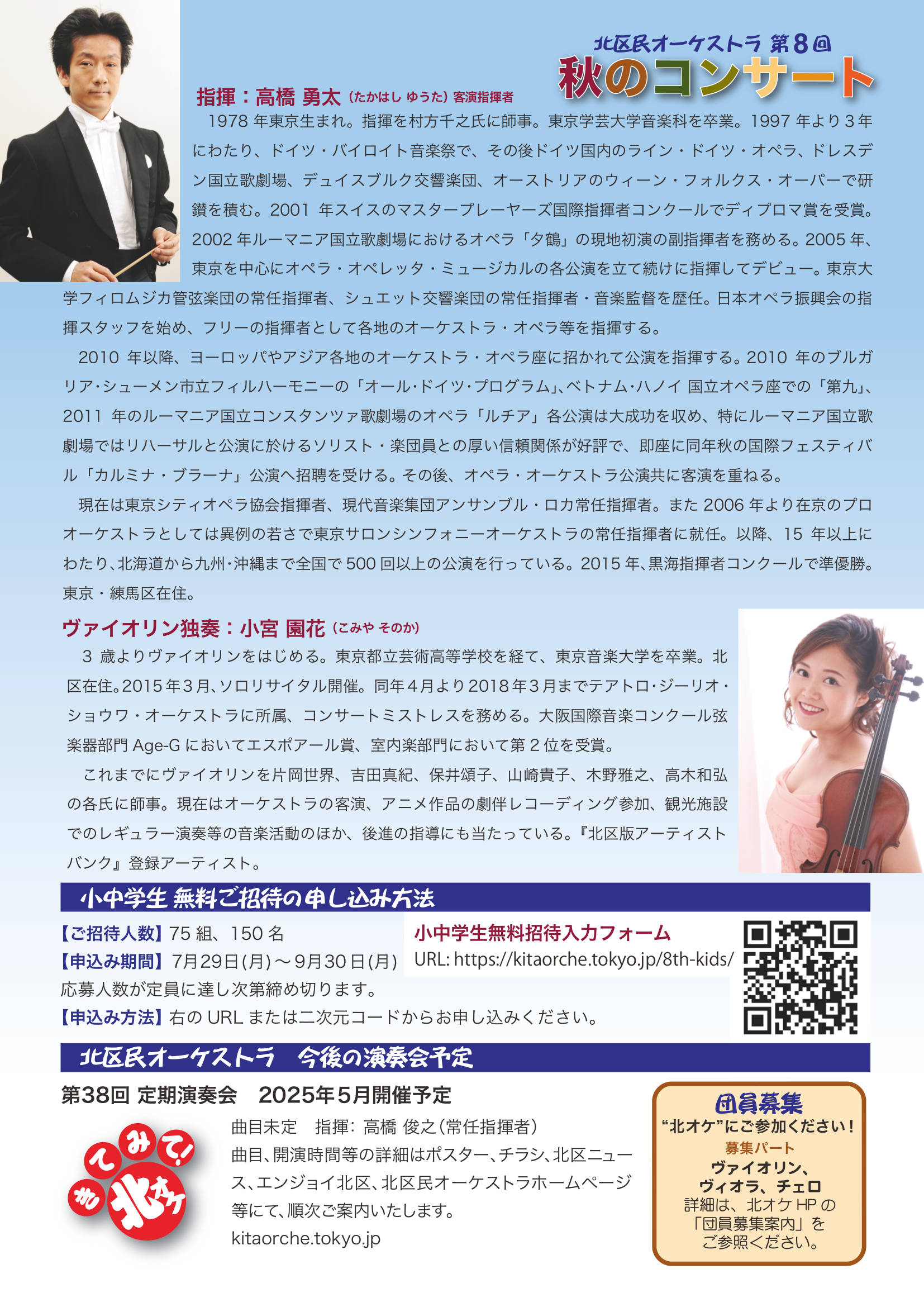 北オケホームページ・小中学生無料招待入力フォームより、必要事項を入力してお送りください。詳しいご案内を折り返しお送りしますので、届いたメールに沿ってお申込みください。