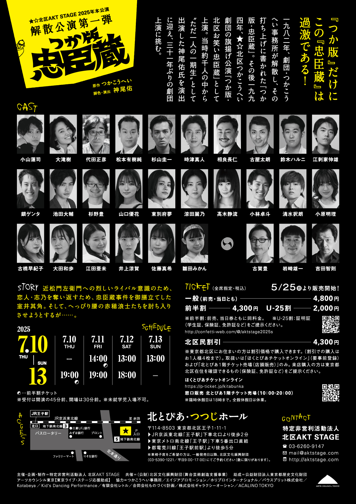 この『忠臣蔵』は過激である!1982年、劇団・つかこうへい事務所が解散し、その打ち上げに書かれた『つか版・忠臣蔵』。その後1994年、★☆北区つかこうへい劇団の旗揚げ公演『つか版・北区お笑い忠臣蔵』として上演。当時約1,000人の中から“ただ一人の一期生”として出演した神尾佑氏を演出に迎え、劇団として31年ぶりの上演に挑む。