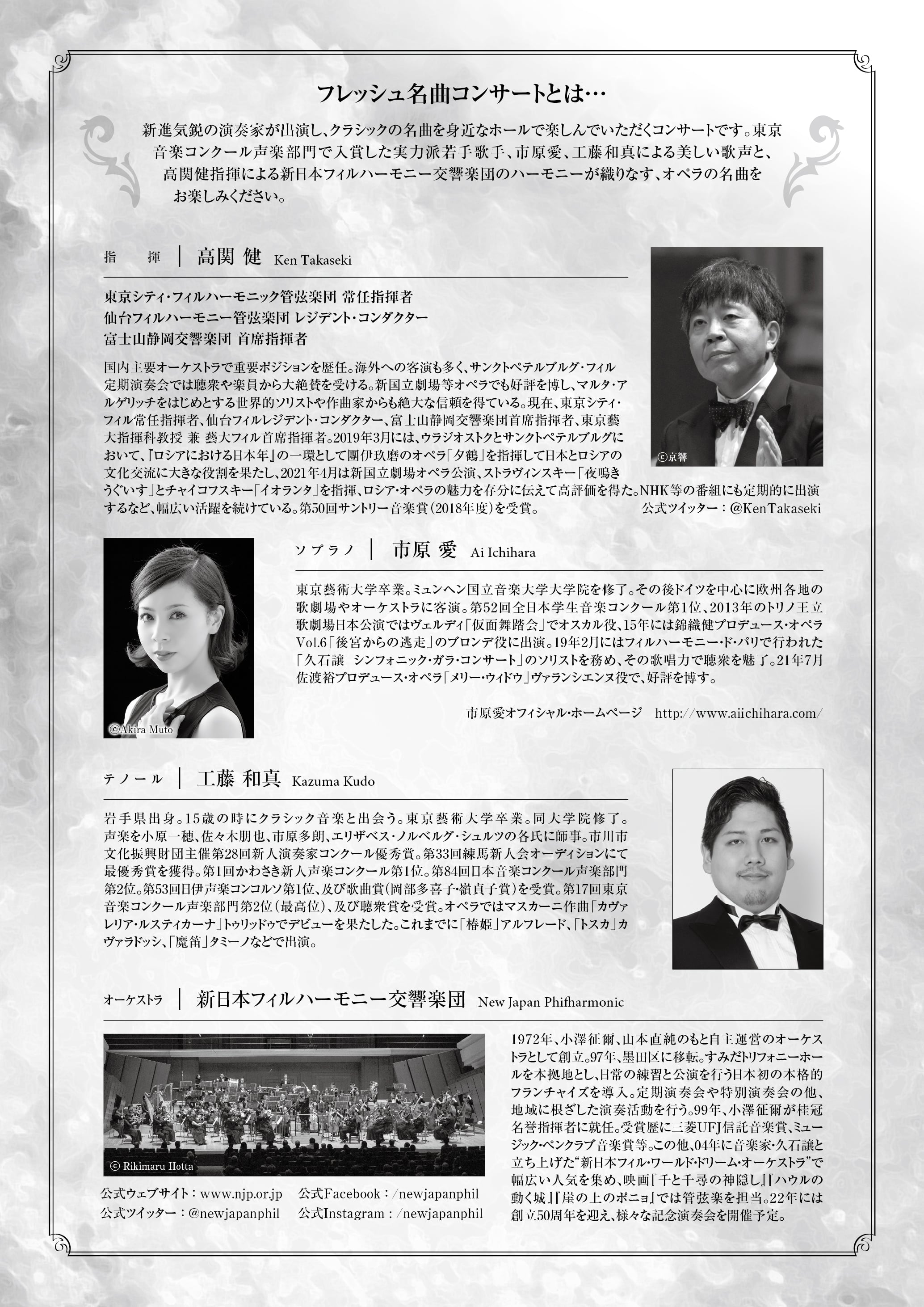 市原 愛、工藤和真による美しい歌声と、高関健指揮による新日本フィルハーモニー交響楽団のハーモニーが織りなす、オペラの名曲をお楽しみください♪