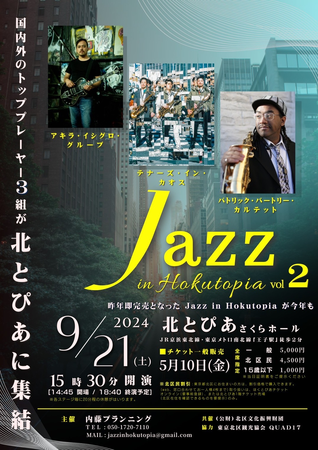 お知らせ詳細 2024年04月19日 「 Jazz in Hokutopia Vol.2」情報を公開しました。 2024年9月21日(土) 「Jazz in Hokutopia Vol.2」 詳細はこちらからご覧ください。