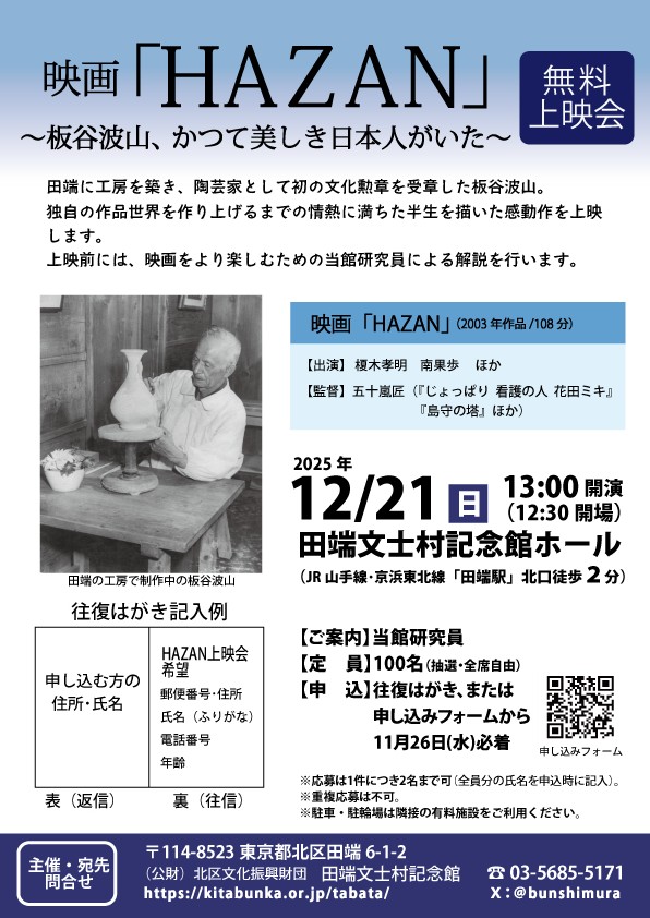 | 概要 | 田端に工房を築き、陶芸家として初の文化勲章を受章者した板谷波山。独自の作品世界を作り上げるまでの情熱に満ちた半生を描いた感動作を上映します。 【映画『HAZAN』~板谷波山、かつて美しき日本人がいた~】 |