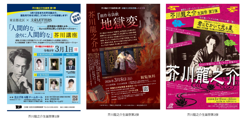 | 概要 | 3月1日は芥川龍之介の誕生日。誕生月の3月に、今年もイベントを開催します。トークショー・人形芝居・演劇の3つの角度から、芥川の人物像や作品の魅力を紐解きます。 |
