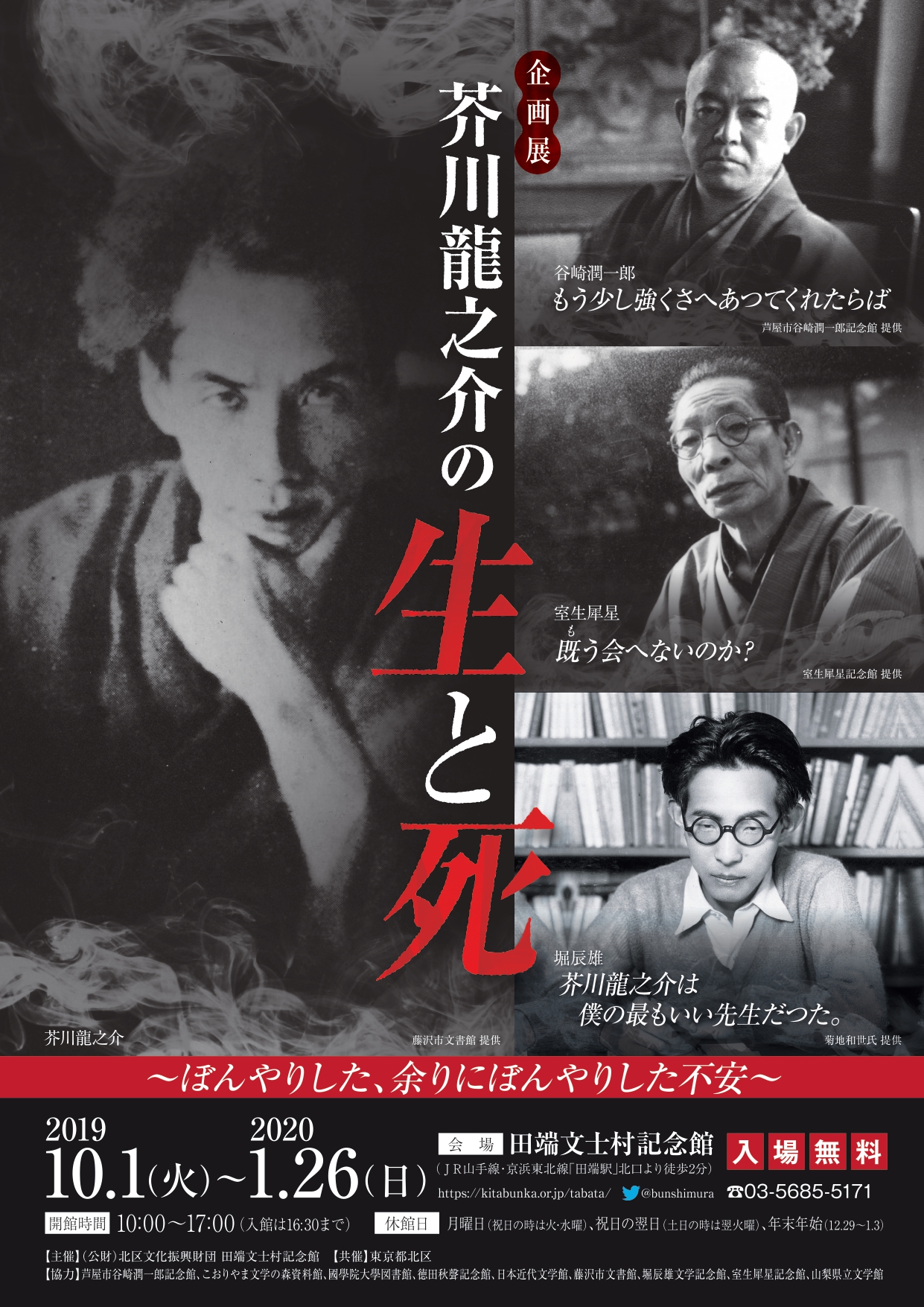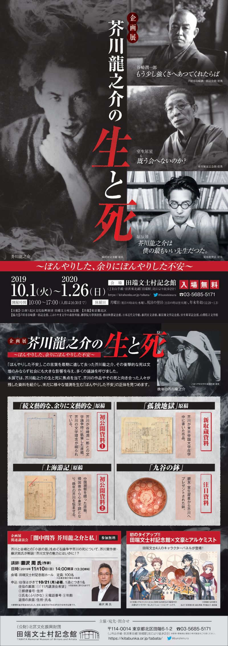 お知らせNews 企画展 展示 田端文士村記念館 企画展 芥川龍之介の生と死~ぼんやりした、余りにぼんやりした不安~ 概要 「ぼんやりした不安」 この言葉を遺して去った芥川龍之介。その衝撃的な死は、文壇のみならず社会にも大きな影響を与え、多くの議論を呼びました。 本展では、芥川龍之介の生と死に焦点を当て、芥川の作品やその死と向き合った人々が残した資料を紹介し、未だに様々な憶測を生む「ぼんやりした不安」の正体を見つめます。 期間 2019年10月1日(火)~2020年1月26日(日) 入場料 無料 PDFダウンロード 一覧へもどる