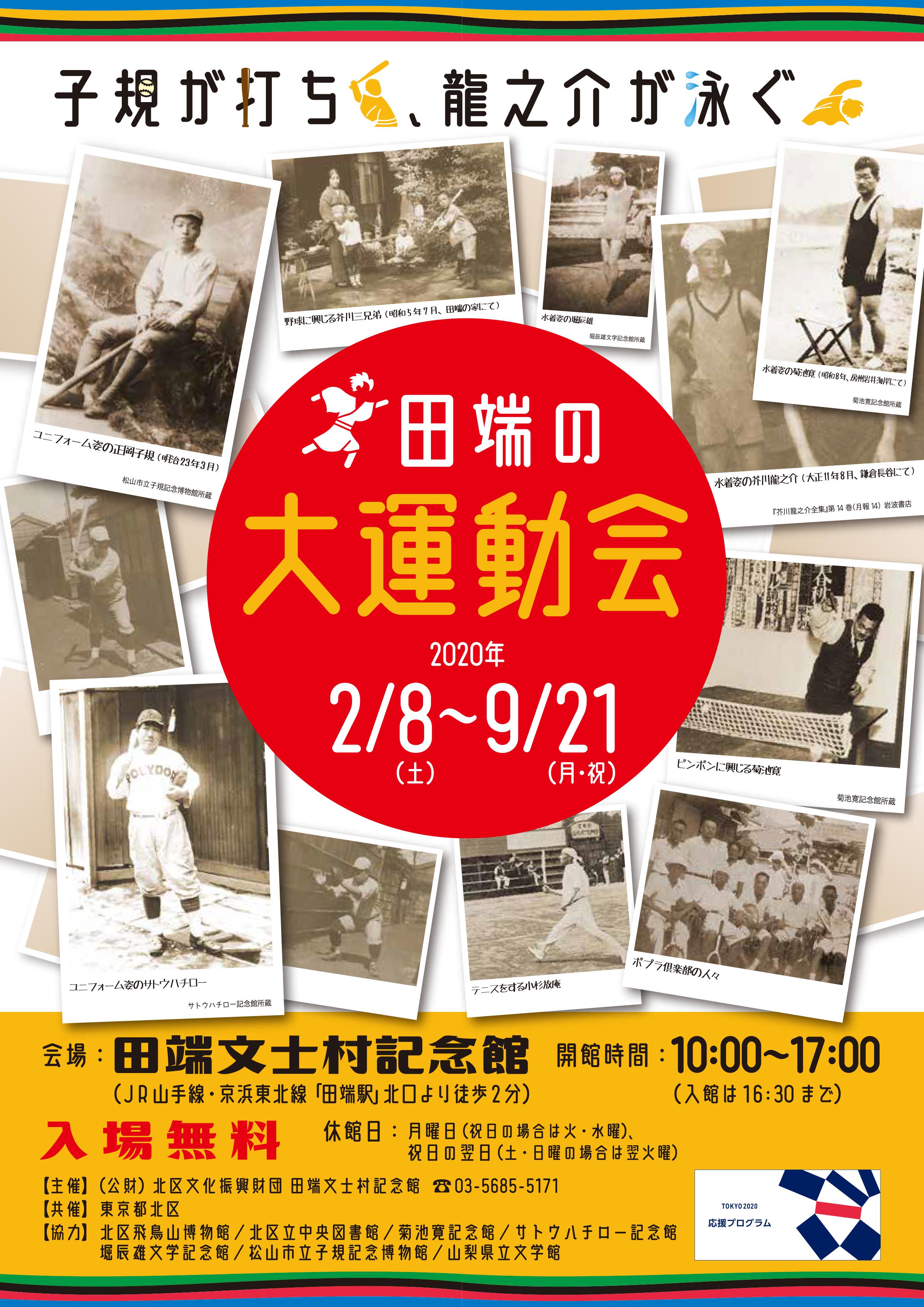 お知らせNews 企画展 展示 田端文士村記念館 企画展 子規が打ち、龍之介が泳ぐ 田端の大運動会 概要 正岡子規からはじまる文士と野球との関係、水泳に夢中になった芥川龍之介など、写真や作品に遺された、文士たちのスポーツに励む姿をお楽しみください。サトウハチローの1964年東京オリンピックを詠んだ詩の直筆原稿をはじめ、オリンピックに関する資料もご紹介します。 期間 2020年2月8日(土)~9月21日(月・祝) 入場料 無料 PDFダウンロード 一覧へもどる