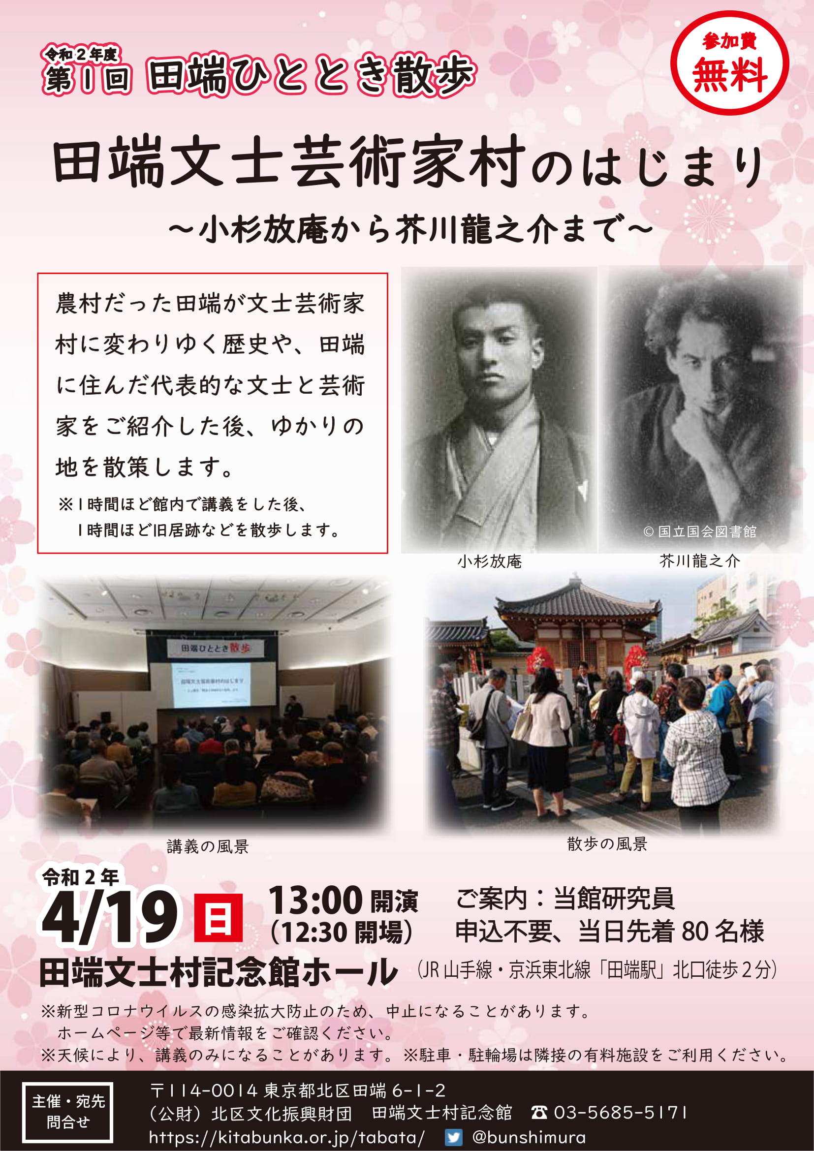 お知らせNews イベント ひととき散歩中止 4月ひととき散歩 田端文士芸術家村のはじまり~小杉放庵から芥川龍之介まで~ 概要 【4月ひととき散歩中止のお知らせ】 新型コロナウイルスの感染拡大を防止するため、4月ひととき散歩につきましては中止することとします。ご理解とご協力をお願いいたします。 一覧へもどる