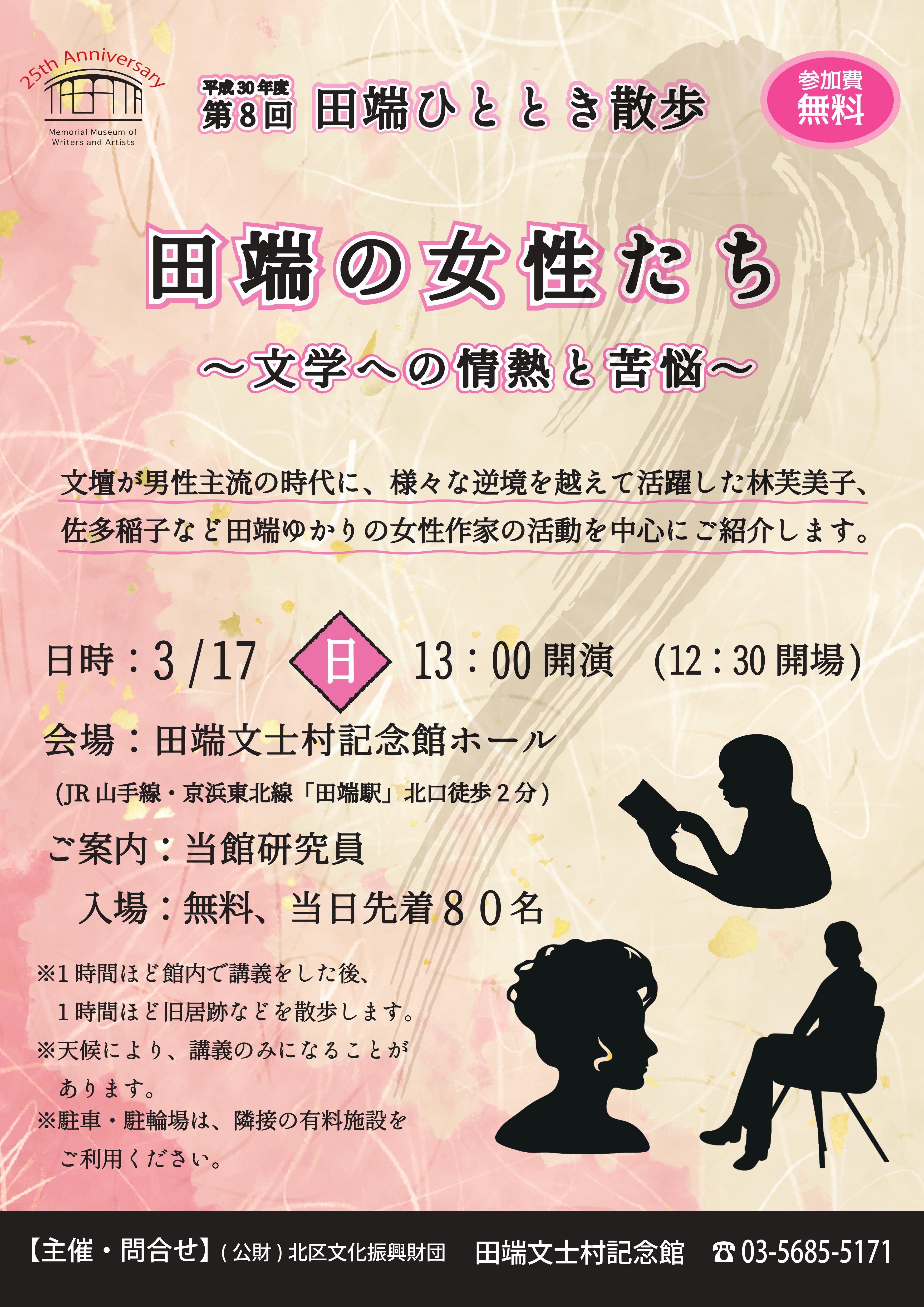 | 概要 | 文壇が男性主流の時代に、様々な逆境を越えて活躍した林芙美子、佐多稲子など田端ゆかりの女性作家の活動を中心にご紹介します。 |