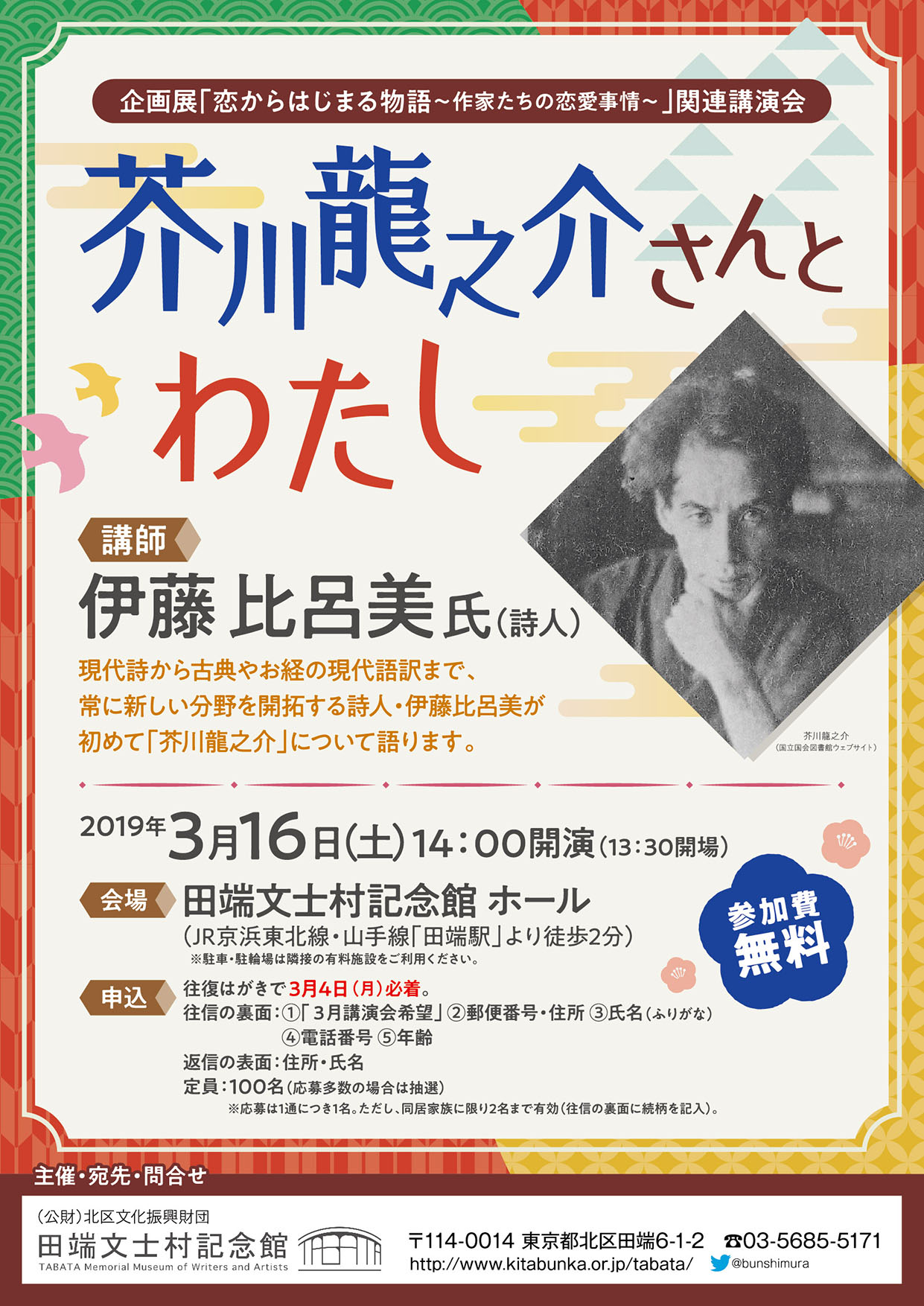 | 申込方法 | 往復はがき(3月4日(月)までに必着) 往信用裏面…①「3月講演会希望」②郵便番号・住所 ③氏名(ふりがな)④電話番号 ⑤年齢 返信の表面:住所・氏名 ※応募は1通につき1名。ただし、同居家族に限り2名まで有効(往信の裏面に続柄を記入)。 |