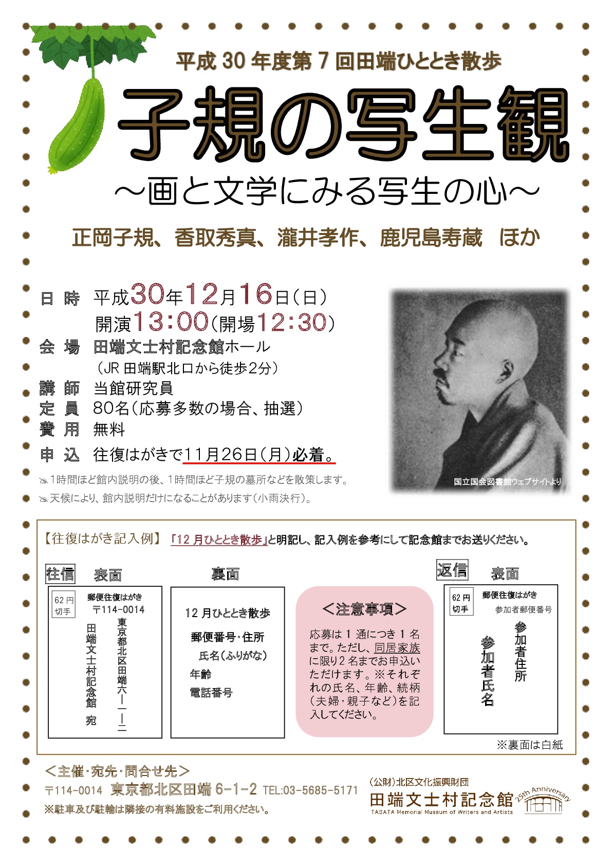 | 申込方法 | 往復はがき(11月26日(月)までに必着) 往信用裏面…①12月ひととき散歩②住所③氏名(2名の場合は全員分)④電話番号⑤年齢 返信用表面…応募者の住所・氏名 ※1通につき1名(同居家族に限り2名まで可)。 |