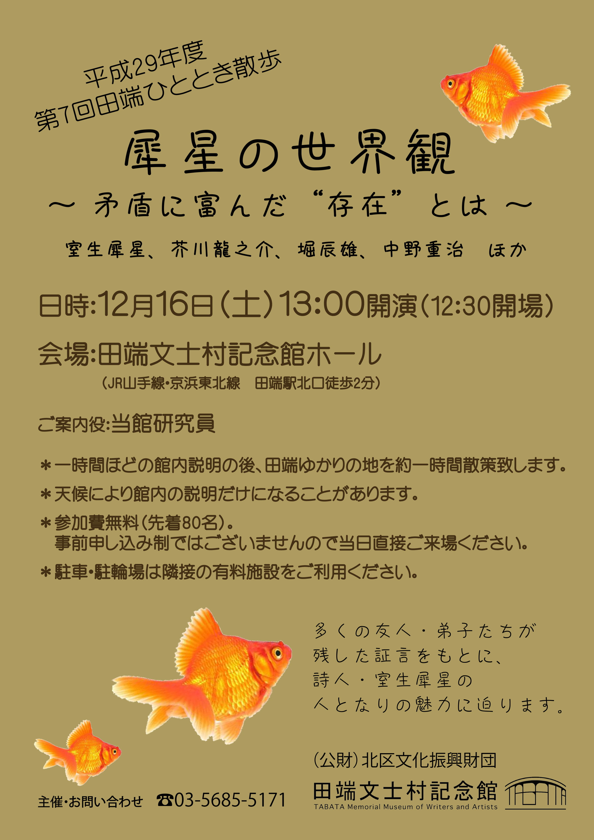 お知らせNews イベント ひととき散歩 12月ひととき散歩 犀星の世界観~矛盾に富んだ゛存在”とは~ 期間 2017年12月16日(土) 入場料 無料 講師 当館研究員 開演時間 13時開演(12時30分開場) 定員 先着80名 一覧へもどる