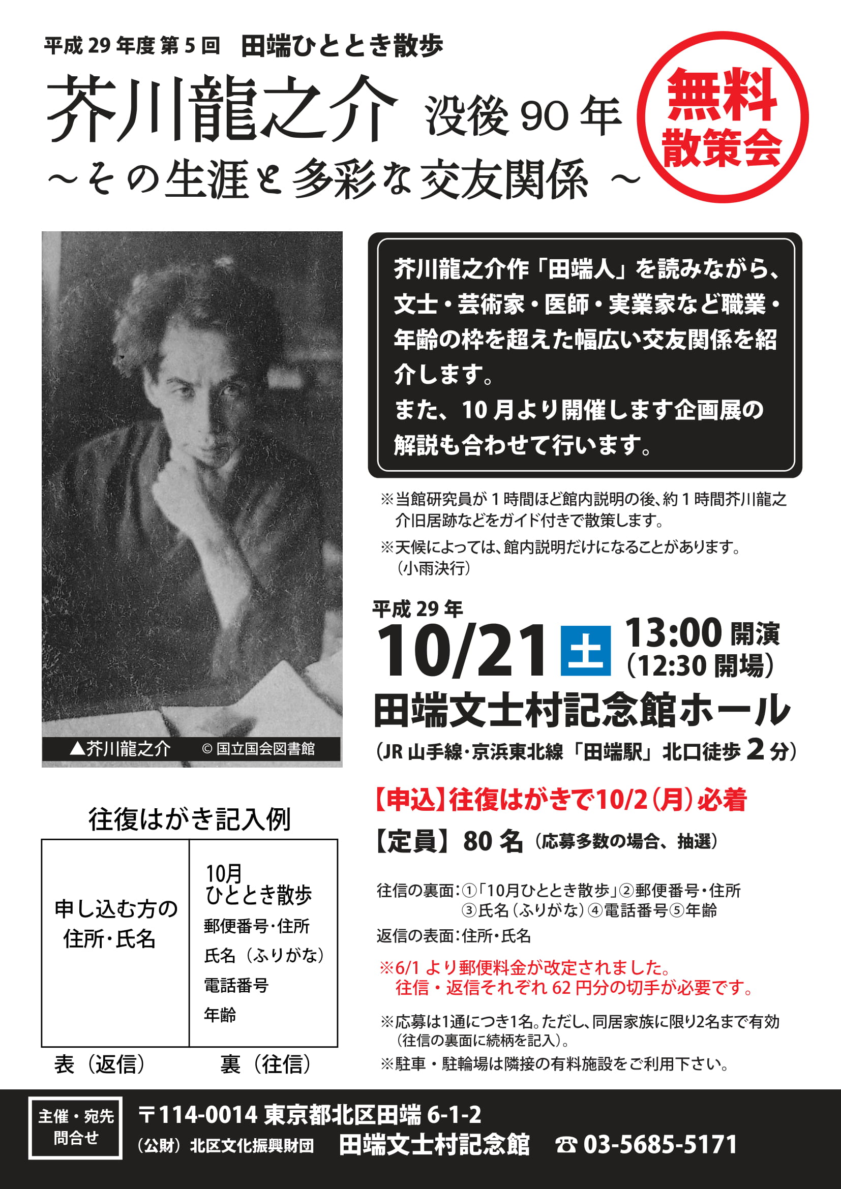 | 概要 | 芥川龍之介作「田端人」を読みながら、文士・芸術家・医師・実業家など、職業・年齢の枠を超えた幅広い交友関係を紹介します。 |