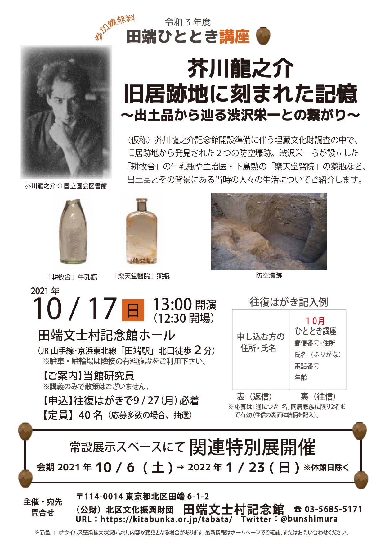 | 申込方法 | 往復はがき(田端文士村記念館宛に9/27(月)までに必着) 往信用裏面…①講座名②参加希望の開催日③住所④氏名(2名の場合は全員分)⑤電話番号⑥年齢 |