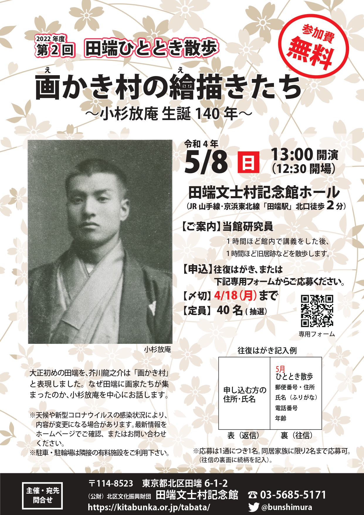 お知らせNews イベント ひととき散歩 5月ひととき散歩 画かき村の繪描きたち~小杉放庵生誕140年~ 概要 大正初期の田端を、芥川龍之介は「画かき村」と表現しました。なぜ田端に画家たちが集まったのか、小杉放庵を中心にお話しします。 期間 2022年5月8日(日)13:00開演(12:30開場) 入場料 無料 申込方法 申込みは締め切りました。 抽選結果 ご応募いただいた全ての方に、4/20(水)に抽選結果をお送りしております。 お知らせが届かない場合は当館までお問い合わせください。 PDFダウンロード 一覧へもどる