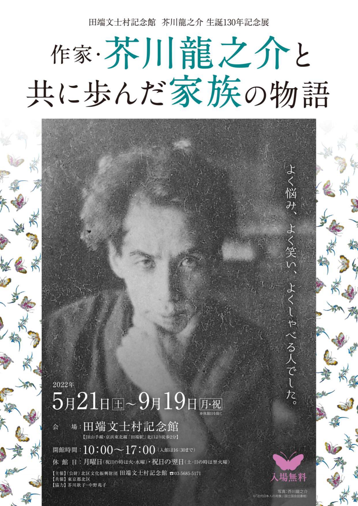 お知らせNews 企画展 芥川龍之介 生誕130年記念展 作家・芥川龍之介と共に歩んだ家族の物語 概要 書斎に座り、眼光鋭く、真っすぐにあなたを見つめている作家・芥川龍之介。 私生活では、よく悩み、よく笑い、よくしゃべる人でした。 妻、息子、姪…家族が紡いだ物語をたどって、 華やかな作家人生の奥にひそむ素顔の“芥川龍之介”に迫ります。 期間 2022年5月21日(土)~9月19日(月・祝) ※休館日を除く 入場料 無料 会場 企画展示スペース PDFダウンロード 一覧へもどる