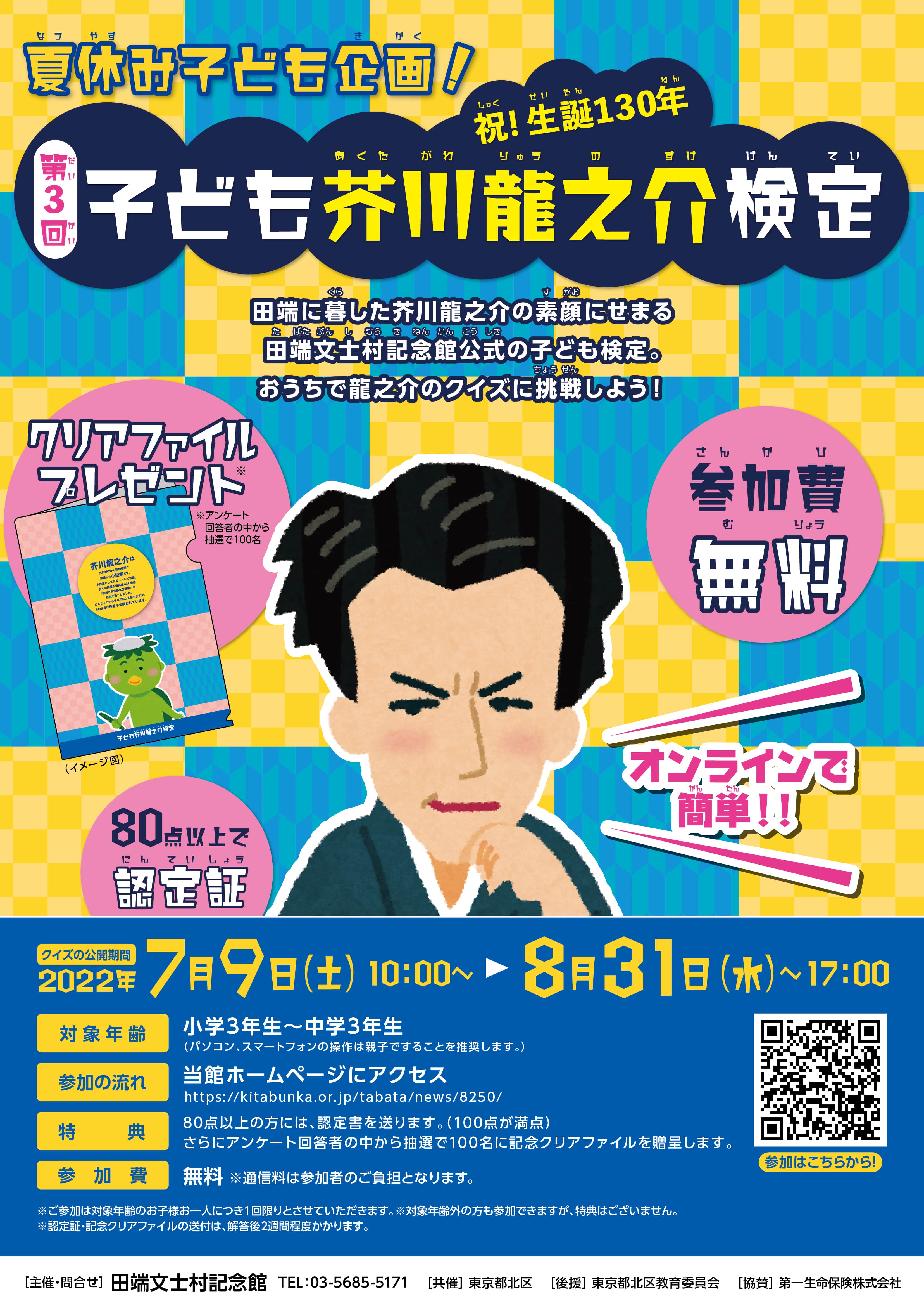 | 概要 | 子ども芥川龍之介検定とは、龍之介のクイズをときながら知識をつける、