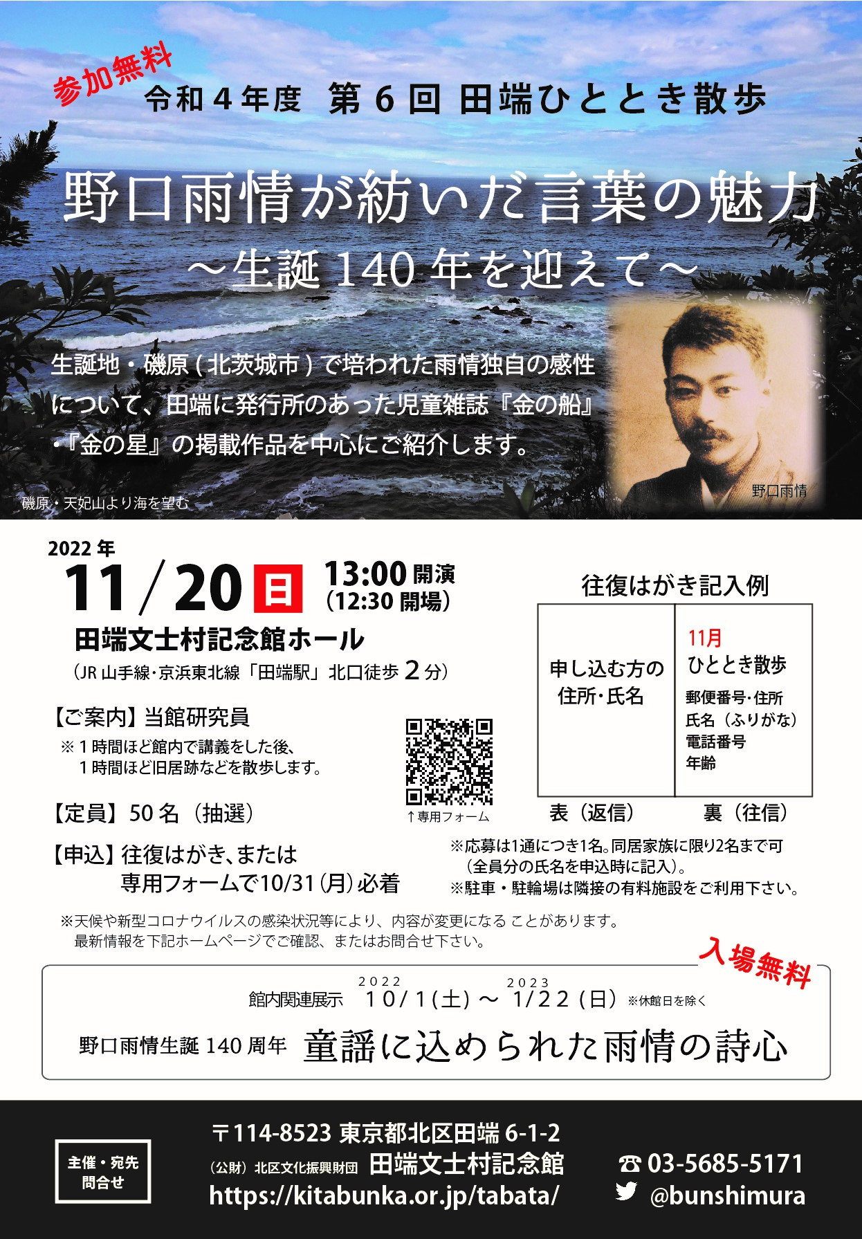 | 概要 | 生誕地・磯原(北茨城市)で培われた雨情独自の感性について、田端に発行所のあった児童雑誌『金の船』・『金の星』の掲載作品を中心にご紹介します。 ※天候や新型コロナウイルスの感染状況により、内容が変更になることがあります。 |